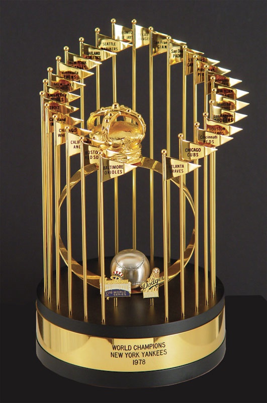 Beaming Mint trophy by Balfour is the coveted miniature version of the revered highest prize in baseball. That Fall Classic that saw the return of Mr. October, and the Yanks victorious again. Not only did New York win back-to-back Championships, they emerged as the only World Champions ever to go down 2 Games and follow by winning straight. 26 pennants surround the crown and baseball sculpture perched on black podium with gold band engraved, “World Champions New York Yankees 1978.”