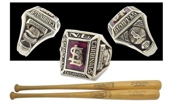 Wayne Granger was the reliever during the 1968 World Series for the defending World Champion St. Louis Cardinals and again in 1970 for the Cincinnati Reds. During the '68 season, Granger set the new NL record by recording 35 saves (since broken). Two Hillerich & Bradsby S2 bats were made for those two World Series, one from each. Both are Hillerich & Bradsby S2’s, measuring 35” with little to no use. Included is his 1968 14-karat white gold St. Louis Cardinals NL Champions ring. Top is red stone with “St. L” team logo in center with “NL Champions St. Louis Cardinals” surrounding in raised text. Left shank is “Granger” on banner with Cardinals cap, two crossed bats, and Busch Stadium model. Right shank is “1968” with bird against baseball design and “29” below. EX-MT.