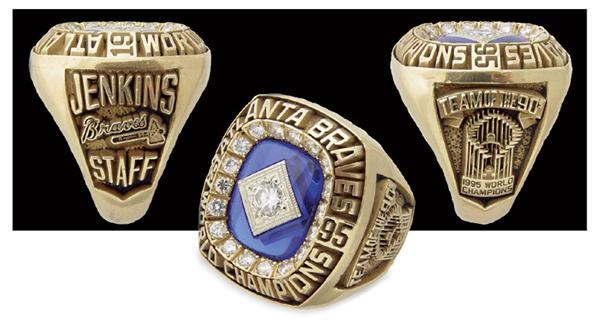 One of the most beautiful Championship rings we have laid eyes upon, this was presented to a member of the Braves’ front office. Top is large blue stone with large diamond in center with 18 smaller diamonds surrounding and “Atlanta Braves world Champions, 1995” surrounding in raised lettering. All raised design: Right shank is “Team of the ‘90’s” with World Series trophy below. Left shank is the name “Jenkins” with Braves team logo and “Staff” below. EX-MT. Size 8.5.