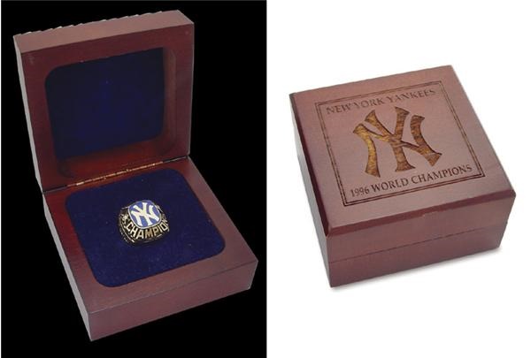 1996 New York Yankeees 10 karat gold Championship ring was licensed by Major League Baseball. Top is large “NY” logo enameled in blue behind surrounded by words, “World Champions” and flanked by two small crossed bats designs with small diamond cut into each. Left shank is “Yankees” with World Series trophy below. Right shank is “1996 World Series” with MLB logo below. Engraved inside as limited edition, “025/500”. Size 8.5 is EX-MT. In splendid original wooden box with “New York Yankees, 1996 World Champions” carved into the top.