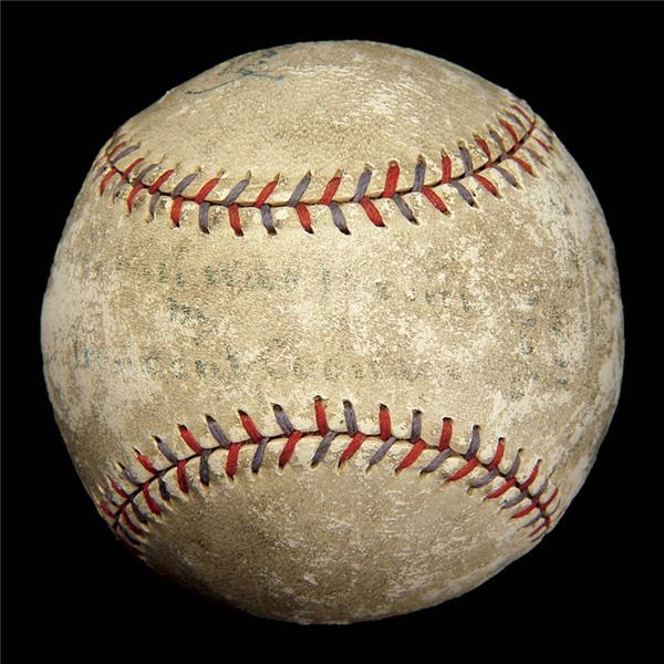 Although the inscription is light, the significance is clear. A momentous ceremonial first pitch from the Golden Era. This OAL (Barnard) baseball was thrown by President Calvin Coolidge for a Major League game in 1928. Severe fading and some scuffing has left the inscription barely legible. You can make out “First Pitch Thrown by President Coolidge” on the sweet spot and the date, “April 10th, 1928” on the panel with “Presented to Pres. E.S. Barnard” on the other. All stampings are clearly legible and the blue & red laces intact. LOA included.