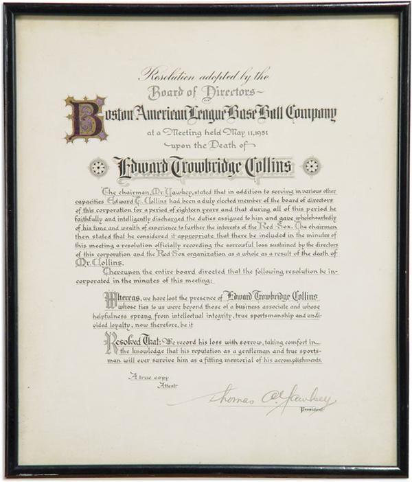 Framed consecration dedicated to Hall of Famer, Ed Collins at the time of his death is signed at bottom by Boston Red Sox chairman and baseball pillar, Thomas Yawkey. These two Hall of Famers were long time friends, and partners in business with the Red Sox after Collins’ playing career was over. It was on the advice from Collins that Yawkey purchased the Red Sox, and it was Collins’ baseball saavy that helped Yawkey make many important decisions. Document is headlined by “Resolution adopted by the Board of Directors - Boston American League Baseball Company at a meeting held May 11, 1951 upon the death of Edward Trowbridge Collins.” Text reads in part, “Resolved That: We recorded his loss with sorrow, taking comfort in the knowledge that his reputation as a gentleman and true sportsman will ever survive him as a fitting memorial of his accomplishments.” Yawkey’s black fountain pen signature is slightly faded, grading a “8” out of a possible 10, but quite large and prominent. Original frame and backing, which has attached to it a letter dated July 31, 1951, from Yawkey to Mrs. Ed Collins, expressing sorrow. Overall EX.
