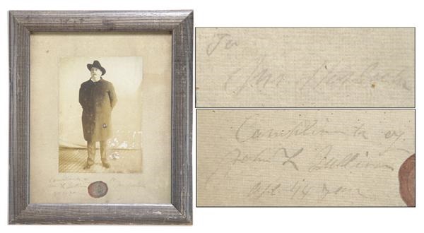 A fine cabinet photo of the Boston Strong Boy in gentleman’s clothing. The immortal link between bare knuckles and gloved boxing stands tall and confident in this studio shot taken by White (Boston), with cartouche at bottom. This rare piece has survived the ravages of time. Some light paper loss on the lower half of the photo, but otherwise VG-EX. Signed on the mount below in slightly faded black fountain pen, “Compliments of John L. Sullivan - To Mr. Hasbache” and dated “April 14.” Framed to 12x14”.