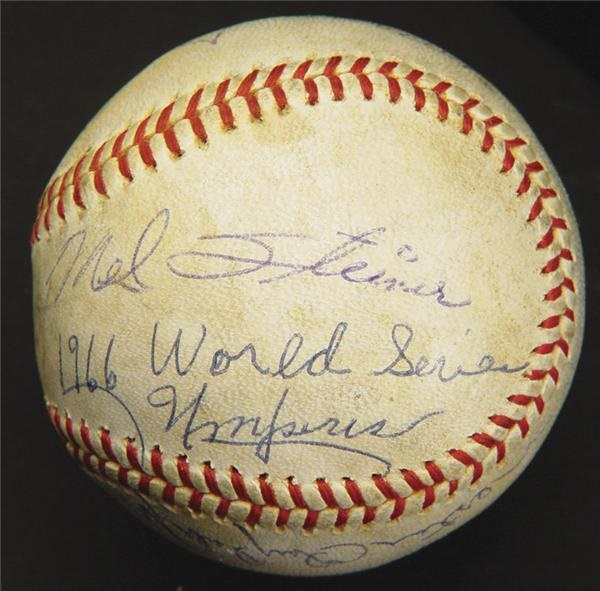 Despite the Los Angeles Dodgers, boasting 27 game-winner Sandy Koufax, the Baltimore Orioles were able to pull off a most surprising sweep of baseball’s new premier dynasty. OAL (Cronin) baseball was used in 1 of 2 Games played at Memorial Stadium in Baltimore. Shows good use and signed by 6 umpires from the 1966 World Series including HOFer, Nester Chylak.