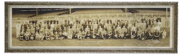 Not the 1927 World Champion New York Yankees, but almost as good, it is Gus Miller’s World Series Ushers, posed in Forbes Field, Oct. 2, 1927. Shows are the 149 young men and children who ushered the 1927 World Series. Photo shows superb contrast and is in apparent Excellent condition except for some creasing in the lower left corner (this does not detract from its overall presentation). Trinity Court Studios cartouche in lower right corner. Original frame and backing (31x10”).