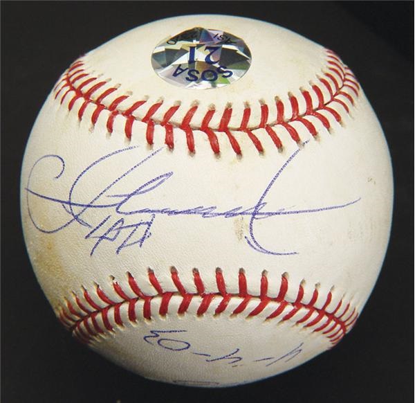 On the fourth day of the fourth month of 2003 Sammy entered the elite “500 Home Run Club” with a screaming line drive off of Scott Sullivan in Cincinnati. Offered is one of the few OML (Selig) baseballs used during play that evening. On its sweet spot Sammy has left his blue ink signature (8/10) and inscribed on the opposite panel, “Game Used 4-4-03”. Complete with the “Sosa 21” authenticating sticker and Sammy’s signed LOA.