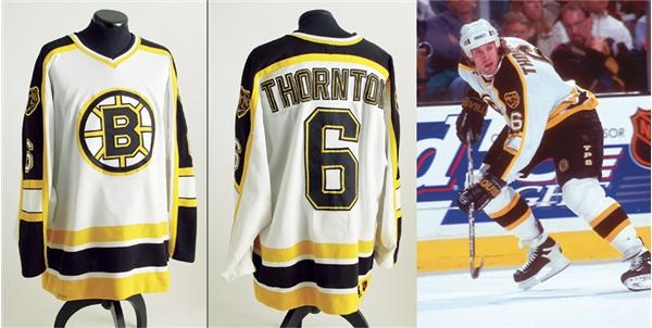 Boston Bruins home white mesh jersey worn by team captain, Joe Thornton. Bruins team logo fills the front. Verso is "Thornton” on straight nameplate with his number “6” below, as well as on each sleeve. Each shoulder adorned with bear head patch. Edge of back tail embroidered with Starter manufacturer logo and the official NHL crest. Collar tagged with “Starter” and “Center Ice Authentic Collection” above. “54-R” is embroidered in black thread on plate below. Nice use.