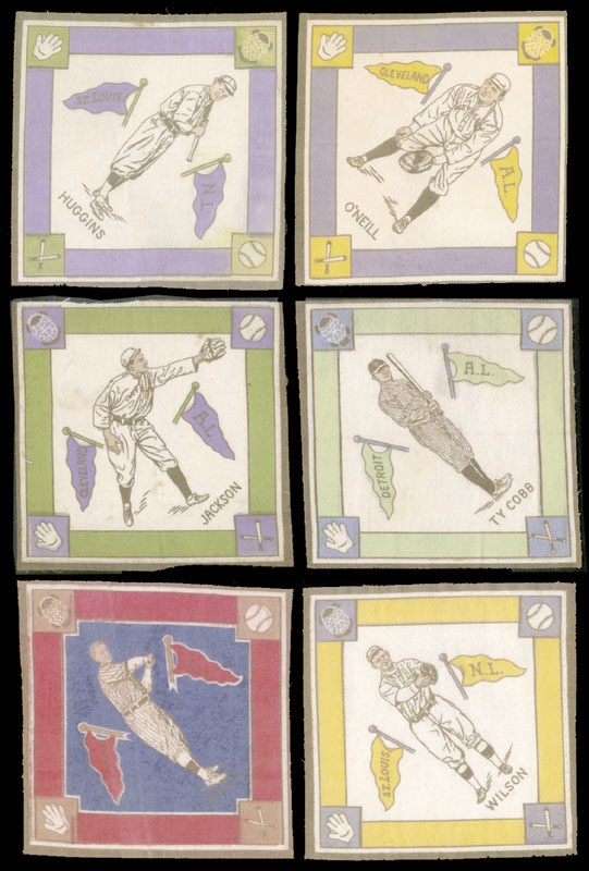 Offered is a near complete set of B18 blankets. These 5 ?” square flannels were issued in 1914 wrapped around several popular brands of tobacco. The flannels picked up the nickname “blankets” because many of them were sewn together to form bed covers or throws. There are 87/90 players present in the set. Lot contains three players with two different variations. There is only one double-a Ty Cobb white infield! Includes: Chance (EX-MT), Chapman yellow flags (EX-MT), Carey purple pennants (VG), Cobb white infield (2) (VG to VG-EX & FR), Demmitt brown infield (VG), Huggins purple pennants (EX), Joe Jackson (VG, the top brown border is mostly gone), W. Johnson (FR), O’Neill yellow pennants (VG-EX), Stengel blue infield (EX), Wallace (VG-EX), Wheat green infield (EX-MT), Wilson yellow pennants (EX-MT). 20 blankets have a small amount of paper stuck on verso. Blankets average 70% EX to EX-MT, 30% VG to VG-EX, a few lesser.