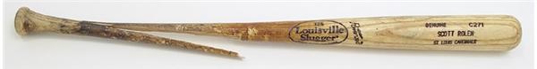 Part of a highly productive St. Louis Cardinals lineup, Scott Rolen shines as the league’s best third baseman. Louisville C271 is a great testament to his hitting power. This piece of lumber got its full use - pounded with ball marks and heavily pine tarred, cracked handle. His number “27” written at both ends.
