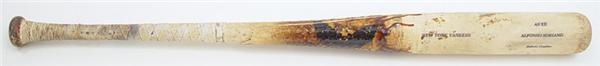 One of the best game-used bats yet from Alfonso Soriano. You will be hard pressed to find one with better use. Sam Bat AS12 is unbelievably pounded with ball and seam marks and a thick coat of pine tar at the top of the cracked handle. Distinguishing criss-crossed white tape down the handle. Written on butt end of barrel is “35 32, 9 oz. 04 03 03 AS 12 2438.”