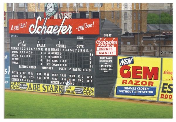Bill Purdom, destined to be one of the most remembered sports artist of all time, has done it again in this tantalizing representation done in 1994 of a timeless Brooklyn baseball moment. Colors and detail are astoundingly real, as Carl Furillo’s 7th inning heroic catch in the final game of the 1956 season of Pittsburgh Pirate Dick Groat’s long drive into right field is diligently re-created to perfection. It’s September 30, the final game of 1956 and the Dodgers lead the 2nd place Braves by just one game, a must win situation. As it turns out, the Braves will defeat the Cardinals 4-2, so Carl Furillo’s spectacular catch proved pivotal in clinching the NL pennant. The menacing right field wall, which was 38 feet tall is the main focus of the work of art - 19 feet of concrete topped by 19 feet of screen. Furillo and Duke Snider were experts at protecting Brooklyn clothier Abe Stark, whose sign under the scoreboard promised: “Hit Sign, Win Suit.” Furillo’s dwarfed figure at the bottom of the scoreboard is airborne, securing the white pill in his glove. Colors are vibrant, looks like it was done yesterday. NRMT. Matted and framed to 38x30”.