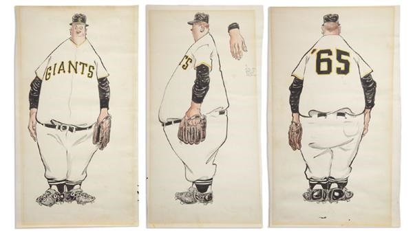 In the world of sports cartoonists, there is no more respected name than Willard Mullin. Offered are three pieces of fabulous original artwork by The Sports Cartoonist of the Century. All three are the same character, the amiable hulk representing the New York Giants, showing him from the front, the back and profile. Done on high quality thick artist’s paper. Each piece measures 13x23”.