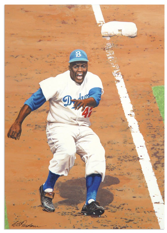 Original work by renowned artist, Bill Purdom is Jackie Robinson, retreating back to third base, after rounding the bag and heading for home. Relating the most captivating and monumental events and sports figures in history, Purdom is not only one of the most prolific sports artists, he is also one of the most highly desired and respected of the modern era. One look at this original work and you will understand why. Doing more than justice to the most important sports figure of all time, Purdom has rendered the Brooklyn Dodger hero and the infield dirt in stunningly live detail. Piece is EX-MT and framed to 16x20”.