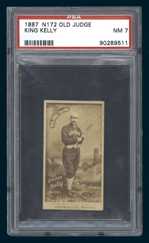 Gorgeous Near Mint example is the only card of King Kelly available in the famed 1887 Old Judge series. Kelly is remarkably well centered with just a hint of corner wear. The photo is fantastic as you can clearly see a brilliant Kelly holding a bat of the era. Verso displays very light toning. It will be hard to upgrade from this example!