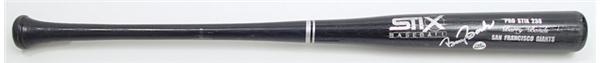 Black Pro Stix 238 was used circa 2000 by hitting machine, Barry Bonds. Known worldwide as baseball’s home run king, Barry Bonds continues to re-write the record books every time he steps up to the plate. You get a game used bat with more preeminence. Signed in silver sharpie on the barrel. Nice use.