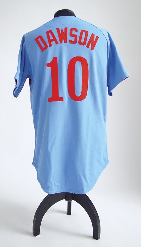 Above the border “Awesome” was an offensive juggernaut and his hustle made him a fan favorite in every town he visited. His blue visitor’s jersey sports the “Expos” team logo on the left chest and his number “10” on the right, both in tackle twill. On the reverse in red, “Dawson” stretches above “10”. The collar is tagged “Rawlings [size] 46” with “Set 1 1981” flag tag on the inner tail. Good use throughout with some light stains under the right arm.