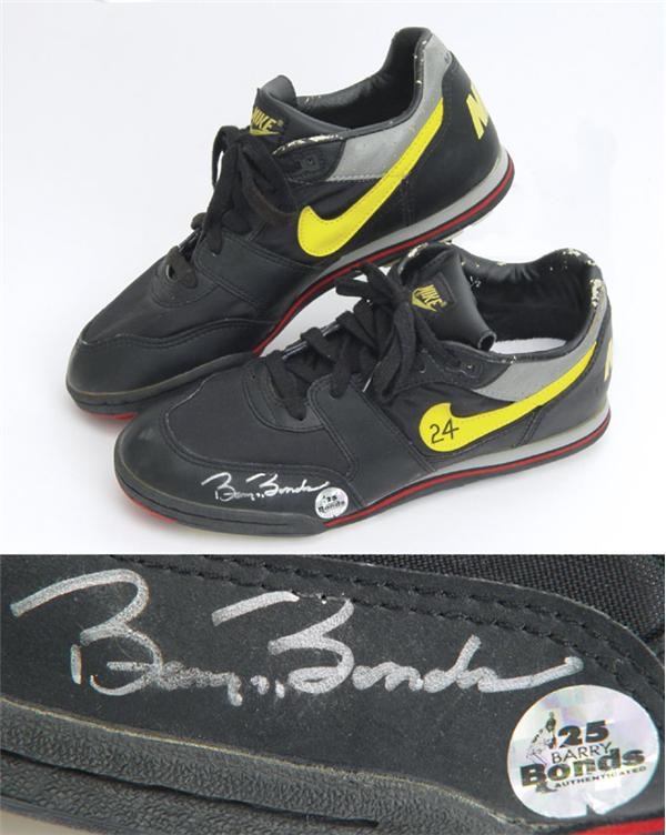 Yellow & black size 10.5 Nike Pro's were obtained directly from the man who is currently re-writing the record books, Barry Bonds.  They display the perfect amount of use, slightly broken in and worn slightly at the tops.  Barry Bonds number “24” written on each outer swoosh.  Bonds has signed in silver sharpie on the outside of the left shoe.  Bonds’ authenticating hologram sticker affixed nearby.  “Bonds” also handwritten in black pen on each heel.  And with his personal LOA included, you can't get a more sound investment.