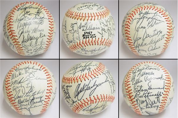 One of the greatest underdogs in the history of baseball, the 1967 Boston Red Sox overcame significant odds against them to win the American League pennant. Nicknamed "The Impossible Dream Team", the Sox finished the season with 92 wins and 70 losses, only to be defeated by the St. Louis Cardinals 4 games to 1 in the World Series. Presented is a lightly toned ball loaded with thirty five (35) signatures. Carl Yastrzemski, Dick Williams, Rico Petrocelli, Mike Andrews, George Scott, Mike Ryan, Reggie Smith, Joe Foy, Jim Lonberg, Gary Bell, John Wyatt, and many more have all penned their names on the ball in Mint black ink. The ball exhibits a single spot of toning on one of the side panels, but otherwise rates EX-MT.