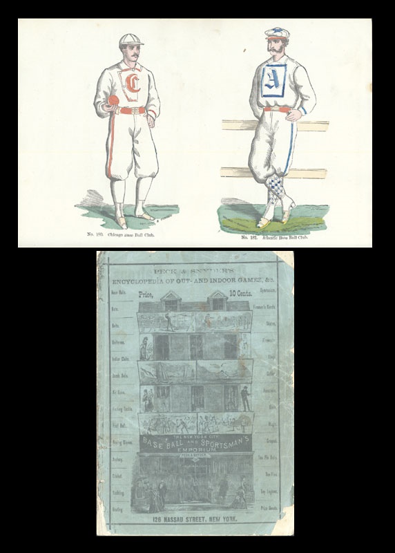 One of the earliest known sporting goods catalogues, this was printed in 1875 by Peck & Snyder and mailed out to their valued clients. Entitled, Encyclopedia of Out and Indoor Games, it is a wonderful assemblage of prices and images of the 19th century equipment and uniform styles. Includes all sports of the era including baseball, boating, cricket, hunting, archery, football, etc. Includes all equipment, trophies, & prizes offered relating to any sport and including military & fireman’s apparel. Countless illustrations are hand-colored. Hand-coloring was a service provided by Peck & Snyder for their clients, as color printing was not yet conceivable. Catalogue is all original. Cover is VG, contents EX.