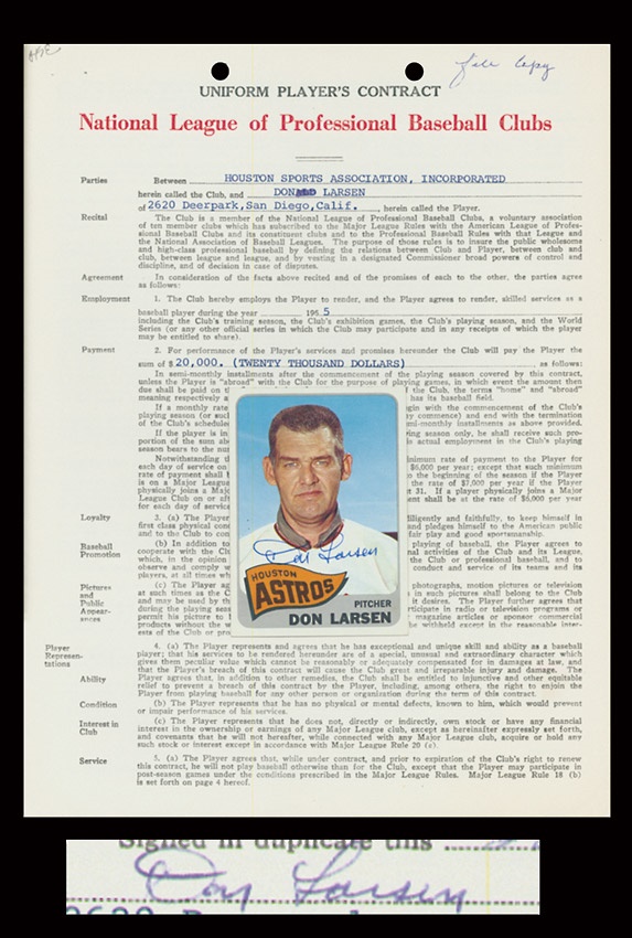 Houston Astros Players Contract for Don Larsen was signed during the twilight of his career. Forever renowned for his perfect Game, pitched in the 1956 World Series when he set down 27 Dodgers in a row for the first and only no-hitter in Series history. 1965 contract is in the amount of $20,000 per year, signed and dated January 22, 1965 by Don Larsen in blue ballpoint. His signature grades a “9” out of a possible 10. Contract grades EX-MT and comes with copy of the letter from GM, Paul Richards to Larsen which was included with the mailed contract. Also includes Larsen’s signed 1965 Topps #389 card.