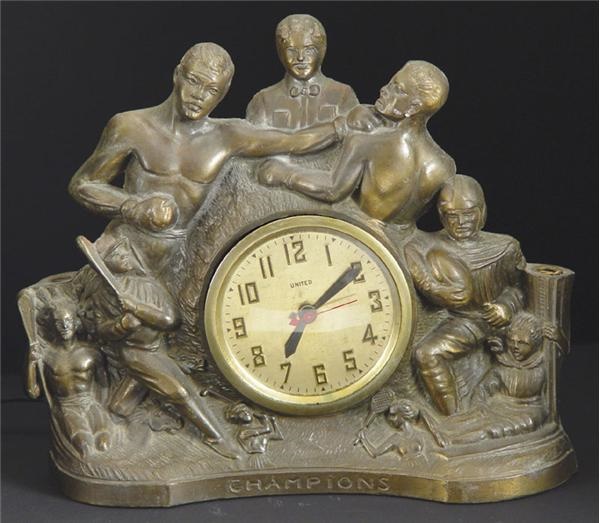 Extremely rare slush white metal clock was produced during the mid-1930s. Look-alikes of the following great athletes populate this tough to find beauty: Joe Louis, Babe Ruth, Red Grange, Helen Wills, Babe Didrikson and more. Made in the same style and time period as the Franklin Delano Roosevelt "Man of the Hour" and other character clocks. By United. Needs replacement plate on back covering mechanism and needs tinkering. Overall EX+. 11x12”.