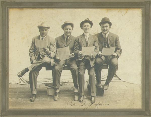 Extremely rare signature from James J. Jeffries on this mounted photo. The champion is shown with others sitting on a bench in period dress holding sheet music. Signed at bottom in black fountain pen, “Jas J. Jeffries.” Signature is still black with minimal fading and grades a “7” out of a possible 10. Antique photo is mounted on heavy cardboard, measuring 12x10”. Some slight toning and some speckled spots in the white areas, otherwise EX.