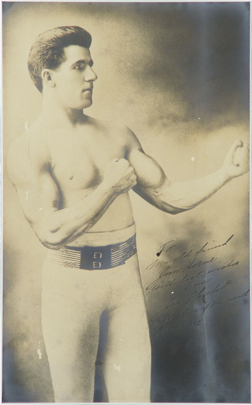 An historic signature from the Gentleman Champion Jim Corbett of immeasurable proportions. Penned on the very day of one of the most important fights in the history of boxing, it is signed with the exact date. On September 7, 1892, James Corbett met John L. Sullivan in the first gloved championship bout, adhering to the Marquis of Queensbury Rules. Corbett KO’d Sullivan in the 21st round, using a far superior boxing strategy. Photo shows Corbett in fighting stance (no gloves). Inscription and signature read, “To my old friend Jim Horne, with best wishes from Jas J. Corbett, Champion of the World - Sept. 7, 1892.” Inscription and signature are strong with very little fading, although there is a crease running through it. Grades 7-8 out of a possible 10, with the latter half of running into the darker part of the background. Photo has a few creases. VG-EX. Double matted to 6.5x10”, framed to 12.5x17”.