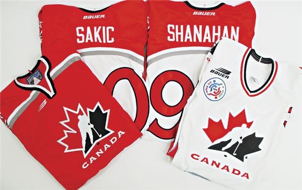 This collection contains some beautiful Team Canada jerseys that were issued to the team but never worn by the players. Nagano Olympic jerseys were made by Bauer and made with Air Knit / Dazzle cloth material. The #20 Joe Sakic with assistant captain's “A” sewn on chest. Includes (2) Shanahan jerseys, one white displaying number "94", the other red with "14". Bauer bar code in the hem. Red Shanahan is a number 14. Also includes Sylvain Cote's rare #3 Team Canada World Cup jersey - team issued but Cote never made the team. Nike bar code in hem and sports the World Cup patch on front shoulder.