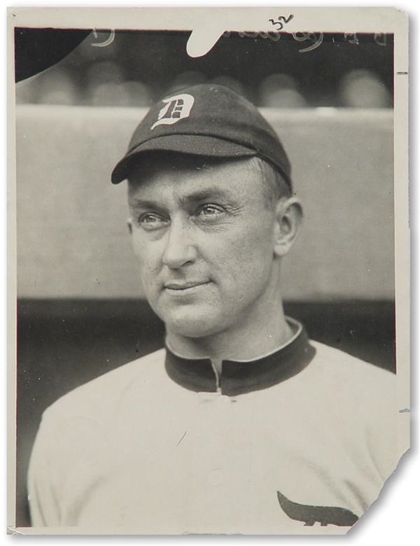 Presented is a spectacular image of "The Georgia Peach", captured by legendary baseball photographer Charles Conlon. Originally part of the Baseball Magazine Archives, the offered photo captures Cobb in a piercing stare, as he stands alone gazing ever so slightly away from the camera. A magnificent representation of Conlon's work, the photo exhibits superb clarity and is worthy of display in any collection of fine baseball photography. The image is missing minute sections of paper at each of three corners, and a larger portion of the lower right hand corner. However, save for the aforementioned flaws, which could likely be remedied by the work of a competent restoration expert, the piece is in Excellent (EX) condition, with the original Baseball Magazine sale hologram on the verso.