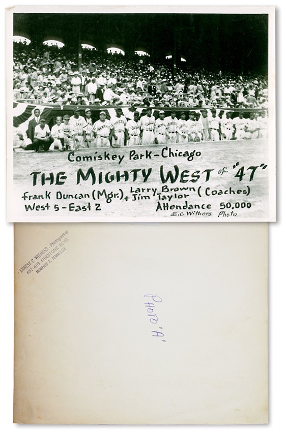 An original 8 x 10 inch photograph picturing the triumphant 1947 Negro League Western All Stars. Played at Comiskey Park before a capacity crowd of 50,000 fans, the Western All Stars defeated the Eastern All Stars by a score of 5 - 2. This was no small feat, as the Eastern All Stars boasted such Negro League immortals as Monte Irvin, Minnie Minoso, Max Manning, Pee Wee Butts, and Biz Mackey. But they were no match for the Western All Stars, who included Sam Jethroe, Goose Tatum, Dan Bankhead, Chet Brewer, Gentry Jessup, Buddy Armour, Art Wilson, Herb Souell, Piper Davis, Quincy Trouppe and Jose Colas. The photograph is inscribed and signed in vintage black ink by renown photographer E.C. Withers. The back of the photo is also stamped "E.C. Withers." An striking visual relic of this team for the ages. Overall EX-MT condition.