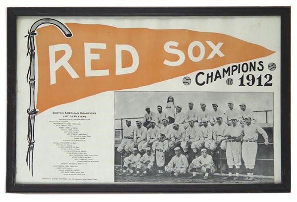 Takes us back to a time when the Boston Red Sox dominated the American League. Shown in this rare vintage print are all Boston legends and the Million Dollar Outfield - Smoky Joe Wood, Hooper, & Lewis as well as Wagner, Ball, Pape, Krug, Carrigan, Yerkes, Henriksen, Engle, Nunemaker, Hall, Gardner, Collins, Stahl, Cady, Thomas, O’Brien, Bradley, McCarthy (mascot) & Wood’s younger sister. Print is pervaded by a red Red Sox pennant and “Champions 1912.” All original frame and backing, print is EX.
