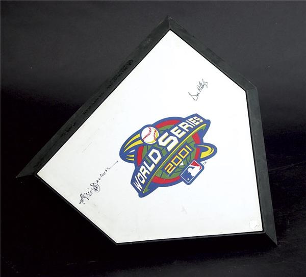 Yankee Stadium’s ceremonial first pitch home plate from Game 5 of the 2001 World Series is adorned with the screened on emblem on top and boasts the black felt tip signatures of Reggie Jackson and Don Mattingly. In NRMT condition, with affixed MLB hologram sticker.