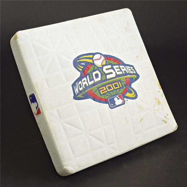 Game used third base from Game 3 of the 2001 World Series, in which the mighty Bronx Bombers were dethroned by the Arizona Diamondbacks is authenticated by Major League Baseball. Marked underneath, “WS Game 3 Set D 3B” with “LF” and an arrow pointing toward left field in marker. Carries team emblems on side plates from both teams. Shows light use and MLB hologram sticker.