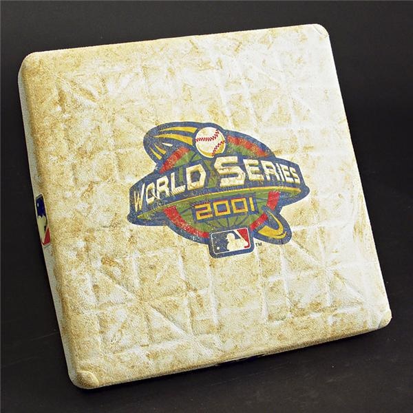 Major League Baseball authenticated base is a genuine piece of stadium history. Used in Game 6 of the 2001 World Series, it is marked underneath in marker, “WS 6 Set B 1B” and “RF” with an arrow pointing toward right field. Sports Yanks & D-Backs team emblems on side plates. Nice use. Affixed hologram sticker.