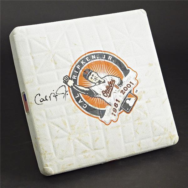 Second base used for the 4th inning of Cal Ripken Jr.’s last Major League game. In a sense it symbolizes twenty-one years, the highlights, the friendships, “The Streak”. It’s impossible to imagine the thoughts and emotions that charged through Cal as he played the final nine innings of his legendary career, but this piece of the infield certainly takes us closer to that moment. Signature in black sharpie, sits to the left of a screened image of himself. “1981-2001” denotes his unforgettable tenor in the Big Leagues. This unique “Original Hollywood base” was manufactured expressly for this final game, marking an end to a truly remarkable career. Four small affixed plates on the base’s sides display Ripken’s legendary number “8” on two sides, “Orioles” on another, and the American flag on the other. Written on underside in black marker is, “October 6, 2001, 8th Inning, 2nd”. Displays good game use and the MLB authenticating hologram affixed to the underside. This was more than a game it was the anointment of a man into baseball sainthood.