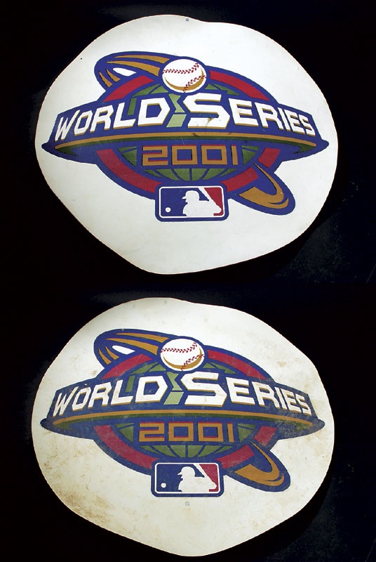 Offered is one on deck circle used in the 2001 World Series from Arizona and one from New York. “World Series 2001” globe logo decal is enormous on each, taking up nearly the entire surface. Diamondbacks on deck circle is heavily trampled with a thick layer of stadium dirt, sneaker & cleat marks. Yankees on deck circle also shows great use with “track” marks left from cleats and footprints made from stadium dirt. Each with affixed MLB authenticating hologram, and each measures 57” in diameter. Top is thin layer of white rubber, bottom is thicker layer of black foam / rubber mix.