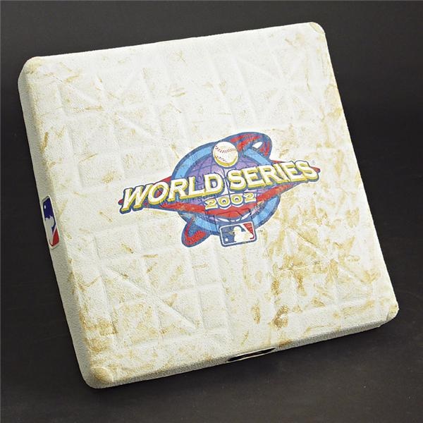 One of the most historic World Series of recent years, the 2002 Fall Classic will be remembered for the only WS appearance of today’s greatest superstar, Barry Bonds. Game Used base from Game 1, in which Bonds homered in his first at-bat shows light use and Anaheim Angels & New York Giants team emblems on the sides along with the MLB logo. Screw holes on one side are further authenticating, along with the affixed MLB hologram sticker.