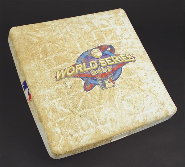 Game Used base from Game 2 of the 2002 World Series is authenticated by Major League Baseball. Shows a healthy trampling of dirt, as expected, the San Francisco Giants and the California Angels combined for a total of 21 runs in the 10-11 Angels victory. Original Hollywood Base with painted “2002 World Series” emblem on top. Marked, “WS 2” underneath in blue marker. Giants team logo displayed on one side, Angels logo missing from the other.