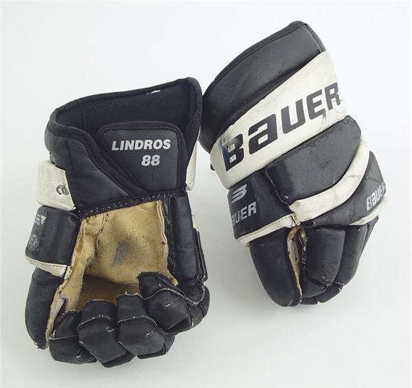 Eric Lindros game used gloves from his second to last season with the Philadelphia Flyers. The Bauer gloves have "Lindros 88" printed on the cuffs and show good game use. LOA.
