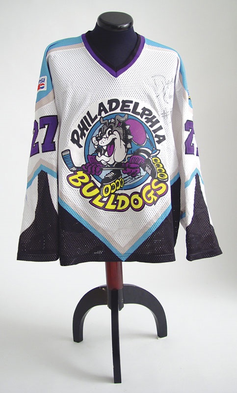 Roller Hockey International was short-lived, but what a ride it was. It helped propel In-line hockey and hockey into the Southern states. The Philadelphia Bulldogs are one of the RHI’s rarest acquisitions. This jersey, worn by Derek Clancey sports the Pepsi and All Sport patches on the shoulders along with "CCM Roller Hockey International" on the hem. Front is signed in a gorgeous silver pen. Moderate game use with board burns and stick marks. LOA.