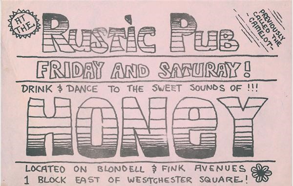 Designed by Ace for his pre-KISS band “Honey” this handbill features a similar logo style to the logo he ultimately created for KISS. Performance at the Rustic Pub located in the Bronx. Spectecular and rare piece for the avid Ace Frehley collector.