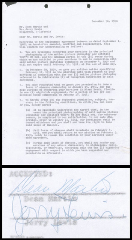 This 2-pages contract is for a pivotal moment in the career of the comedy team of Dean Martin and Jerry Lewis. Signed by both in 1950, for the principle photography for the 1951 film “That's My Boy” marked the first time they were given actual roles rather than performing extensions of their famous nightclub personalities. It is one of their best movies, with sports content as Jerry plays "Junior" Jackson, son of an overbearing former football great at Ridgeville College sent by his father to play for the squad. The coach must honor the wishes of such a prominent alum, but is fortunate to have ringer Martin looking out for Lewis. Comes with a cover page dated December 30, 1950. Signed in teal blue ballpoint the signatures are NRMT and the actual contracts are VG-EX as there is a small piece missing from the top and there are two-holes punched for filing. Measures 8.5x11”.
