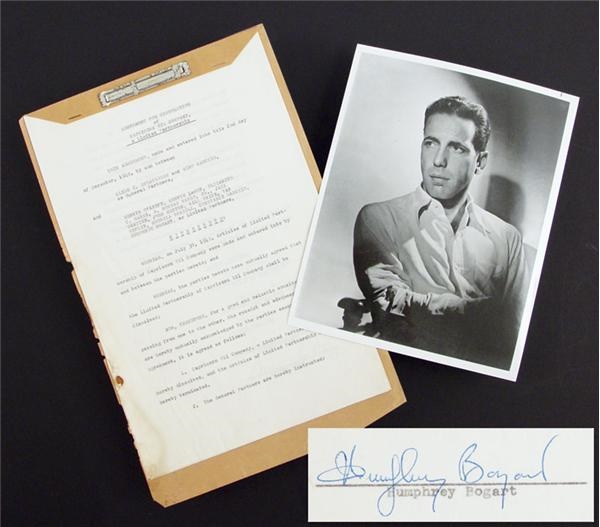 4-page contract for the Limited Partnership of Capricorn Oil Company is an “Agreement for Dissolution”, signed by 18 people, including star of the silver screen, Humphrey Bogart, who has signed as one of the limited partners. Blue ink signature grades a strong “8” out of a possible 10. Contract is VG. Comes with 8x10” b/w photo of Bogart.