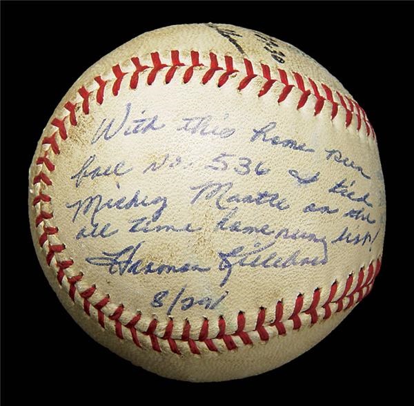 One of the most historically significant home run baseballs you can own, this is the very one which Hall of Famer Harmon Killebrew smacked out of the park for his 536th homerun, tying Mickey Mantle on the career home run list. Killebrew would of course retire with a total of 573, but this 536th was very important to him, as you can tell from the carefully inscribed panel, which reads, “With this home run ball No. 536 I tied Mickey Mantle on the all time home run list! Harmon Killebrew, 8/29.” Blue ballpoint inscription is bold and unbled, grading “9” out of a possible 10. OAL (Cronin) baseball shows nice use and rubbed up with stadium dirt. Also written over the logo on the south panel in black felt tip is “536 / 8-29-30 Cuellar.” Accompanied by LOA.