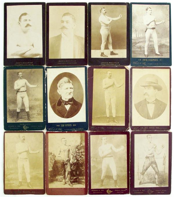 One dozen cabinet photos of the most recognizable faces in boxing at the turn of the century include: John L. Sullivan (three different poses), Jack Dempsey, Joe Goss, James Mace, Jim Ward, Joe McAuliffe, Tom Allen, Ike Weir, Charles Mitchell, and Yankee Sullivan. Taken by, photographer and publisher of the Police Gazette, Richard K. Fox, each image is surrounded by a border of either black or brown and embossed in gold. The overall condition can be described as VG-EX, there is a piece of the border missing from the Ward and the Allen appears trimmed.