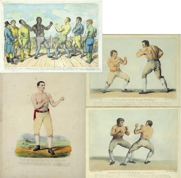 Four beautifully composed early prints of pugilists from across the pond. 1) “English Champion, Tom Sayers”, published 1860 by Currier & Ives, 14x18”. EX. 2) “Thomas Johnson & Isaac Perrius”, drawn by C. Metz and engraved by T. Grozer, published 1789, 11x14. EX. 3) “Daniel Mendoza & Richard Humphreys” drawn by C.R. Ryley and engraved by T. Grozer, published 1790. EX 4) Crib & Molineaux, pubished 1811. EX. All are matteed and framed.