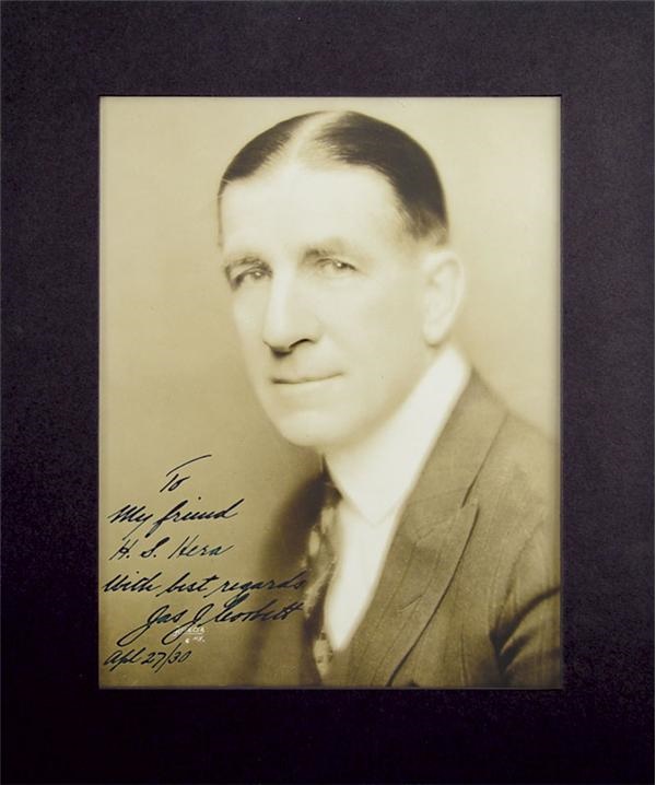 The subject of this original studio photo is James J. Corbett, as he appeared after his illustrious boxing career. In period dress, he appears as gentlemanly as his fabled story states. The inscription and signature are remarkable and bold in thick black fountain ink: βTo my friend H.S. Hera, with best regards, Jas J. Corbett - April 27/30.β Grades β9β out of a possible 10. Some minor creasing towards the top of the photo and some scrapbook damage to top edge, which is not visible with the matting. Otherwise EX.