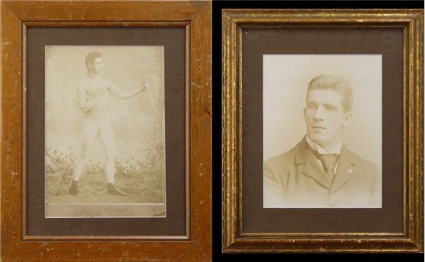 Offered are two large vintage framed photos of Gentleman Jim, each measuring 11.5x16". These incredible early 1890’s original antique studio photographs show James J. Corbett in a bust pose wearing period dress of the era, and in fight pose. One is EX-MT except for some minor spotting, the other is EX except for some minor creasing and one light surface scratch. Matted and framed to 19x23”. LOA.