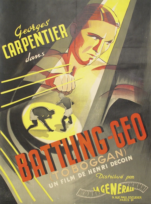 Stunning Art Deco movie poster starring Georges Carpentier perhaps the greatest European fighter of all time. Entitled “Battling Geo (Toboggan)” a French film by Henri Decoin. Film was originally titled “Toboggan” and then re-released in 1948 under the name Battling Geo, a much better name for a boxing movie. This is the 1948 re-release poster, the artwork is Avante Garde boxing images and simply magnificent, executed in brilliant, resonant color. Linen-backed, the poster measures 47x63” (standard French size) and is NRMT.
