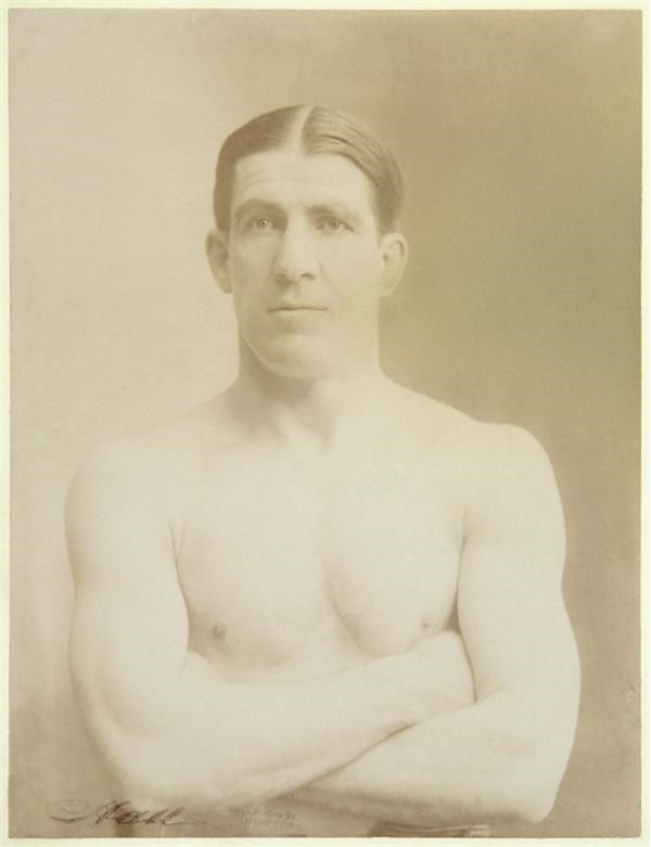 Handsome studio portrait is a magnificent original antique cabinet photo of James J. Corbett, depicted in bare bust pose with arms folded. This is how he looked shortly after winning the title from John L. Sullivan in 1892. A beautiful sepia tone image in apparent EX-MT condition. Masterfully restored. Extremely tough to find in this size. Carries the cartouche, "Broadway & 34th St. New York" and marked, "Hall" on the bottom edge in black fountain pen. Mount measures 13.5x17". LOA.